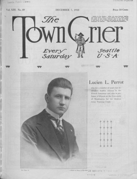 On the cover of the December 7, 1918 edition of the Town Crier was the dashing Lucien Perrot. Perrot, for years, had been teaching the citizens of Seattle the French language and was a professor at the University of Washington for the Student Army Training Corps.