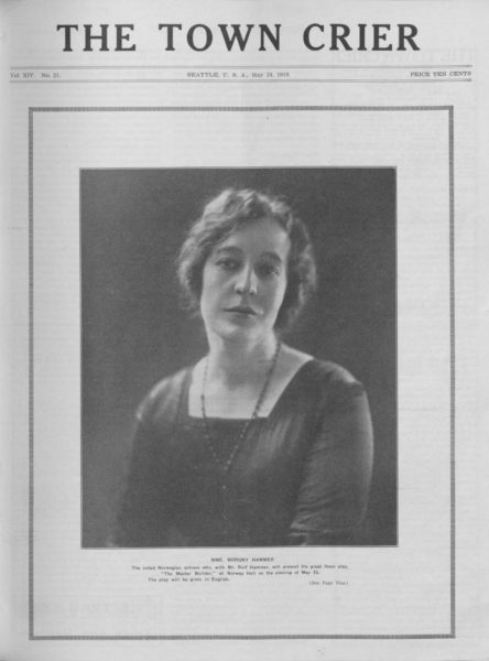On the cover of the May 24, 1919 edition of the Town Crier was Mme. Borgny Hammer. Mme. Hammer and her husband Rolf were coming to Seattle to perform at Norway Hall. They were going to perform Henrik Ibsen’s play, The Master Builder. Adele Ballard, a Town Crier regular, with her column “Various and Sundry,” said of the acclaimed actress, “I saw her the other day for a few minutes. She came into the office and it was a warm and rather enervating day, but in about one minute, or less, she re-vitalized the whole atmosphere with her vivid personality: she is like the breezes blown from the sea across the snow-capped mountains, or like the wild flowers of her own land, the hardy ones that force their way up through the rocks into the sunlight of Norway.” High praise, indeed!