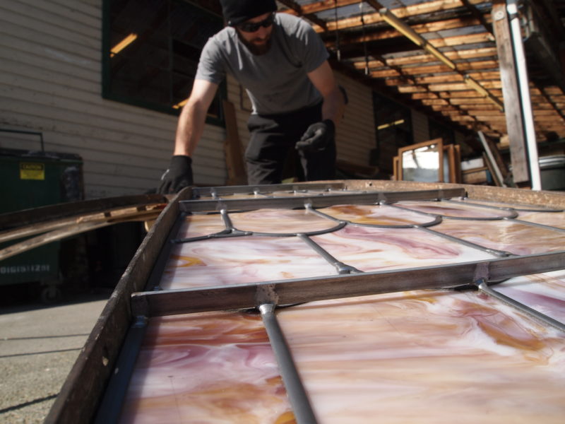 The Great Hall’s signature oculus has returned from its extensive restoration! After nearly one year offsite with the experts at Seattle Stained Glass, the oculus has been revitalized and reassembled—and the transformation is stunning. The oculus won’t be installed until the renovation is nearly complete, but our skilled construction team has afforded us a glimpse at another of our building’s restored windows.