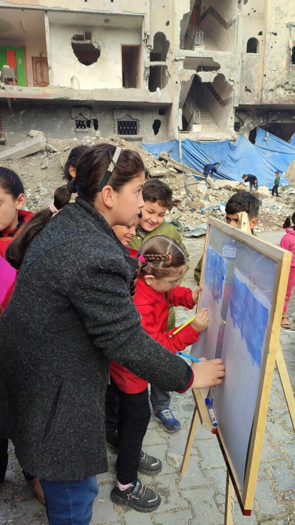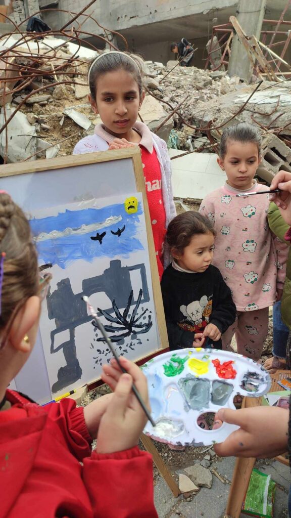 Children from 4 to 14 began to paint. They wanted to draw their homes — their homes when they were beautiful and their homes when they were destroyed — they wanted to paint what they were experiencing. Most of the children were living in tents after their homes were destroyed by Israeli military air strikes, including eight siblings whose parents were killed. In Diab’s words: “I would begin with 10 children, and soon there were 100 coming from all directions.”