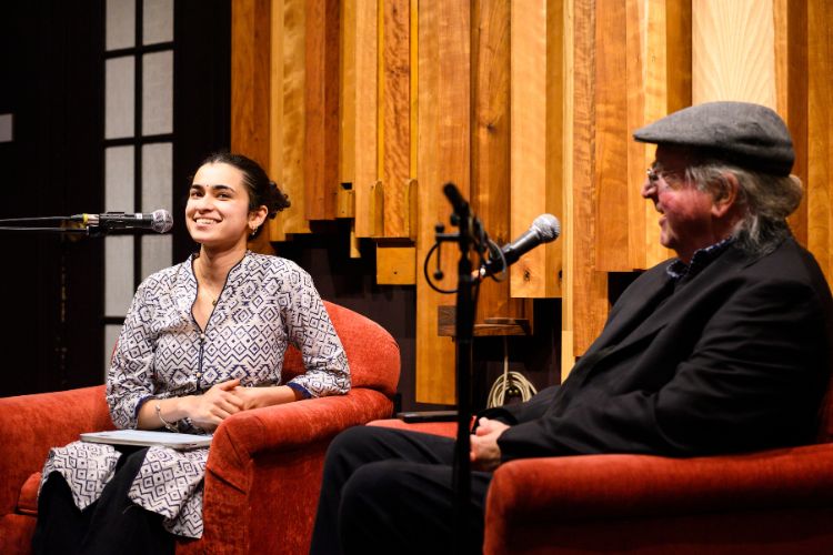 Top Photo: Audiences enjoy the music of Ukrainian artist Maryna Krut in the Wyncote NW Forum; Center photo: violinist Neethi Belur talks with Global Rhythms curator John Kertzer in the Mehdi Reading Room; Bottom Photo: Town Hall Members browse a pop-up book nook in the Nordhoff Lounge.