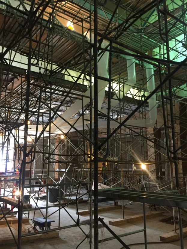 Our friends at Rafn Construction have been using these scaffolds to give the Great Hall a face lift, accessing the ceiling to install new molding and lovingly remove the stained glass windows for restoration offsite. Construction is going well, and we’re thrilled to watch the space transform over the next few months! When the upgrades are installed and the renovation is complete, we’re looking forward to inviting our community to fill the stately oak pews once again, and filling the Great Hall with the voices of our city.