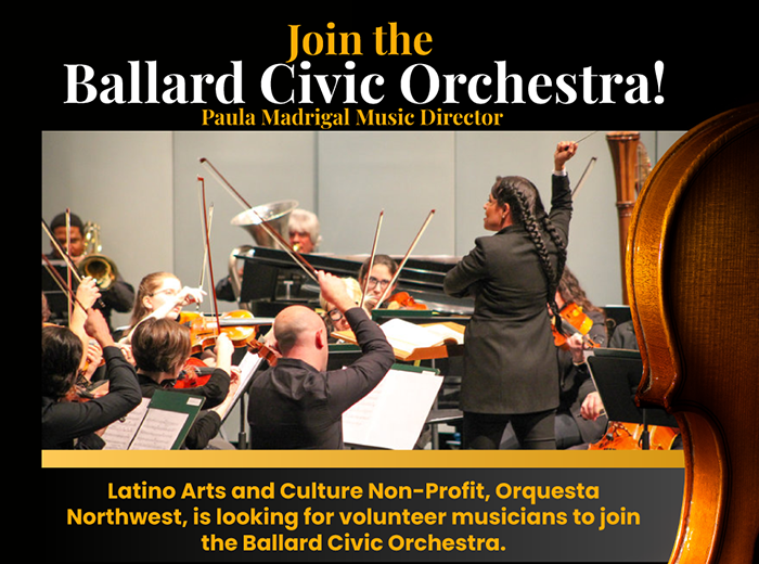 Under the guidance of acclaimed conductor Paula Nava Madrigal, Orquesta Northwest serves as the umbrella organization for three incredible initiatives in the Puget Sound area: The Ballard Civic Orchestra, a prominent hub for Latinx musicians performing under Maestra Paula’s leadership; Cascade Conducting, an annual week-long conducting masterclass; and World Youth Orchestra, which provides free instruction and instruments to underrepresented students, with a focus on empowering Latinx youth.